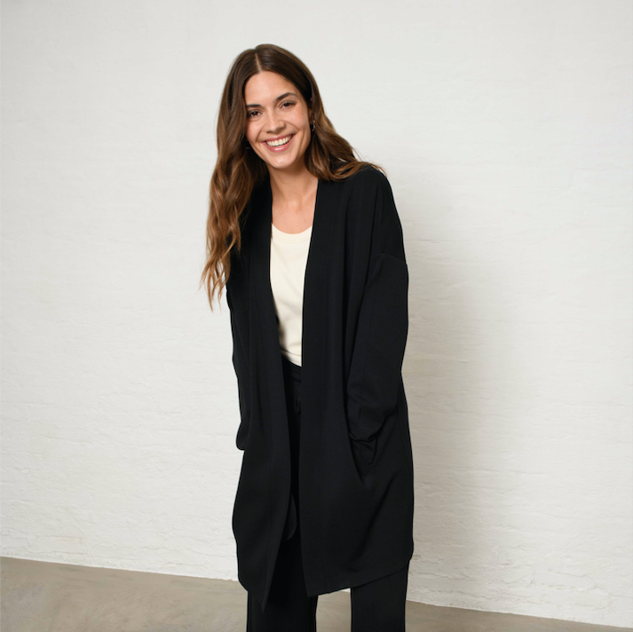 A timeless cardigan made from a comfortable blend of 48% Modal, 48% Polyester, and 4% Elastane. This garment features a streamlined open front, long sleeves, and a straight hem that falls to mid-thigh, providing a relaxed fit. Its design pairs well with both casual wear and formal attire for a variety of occasions.
