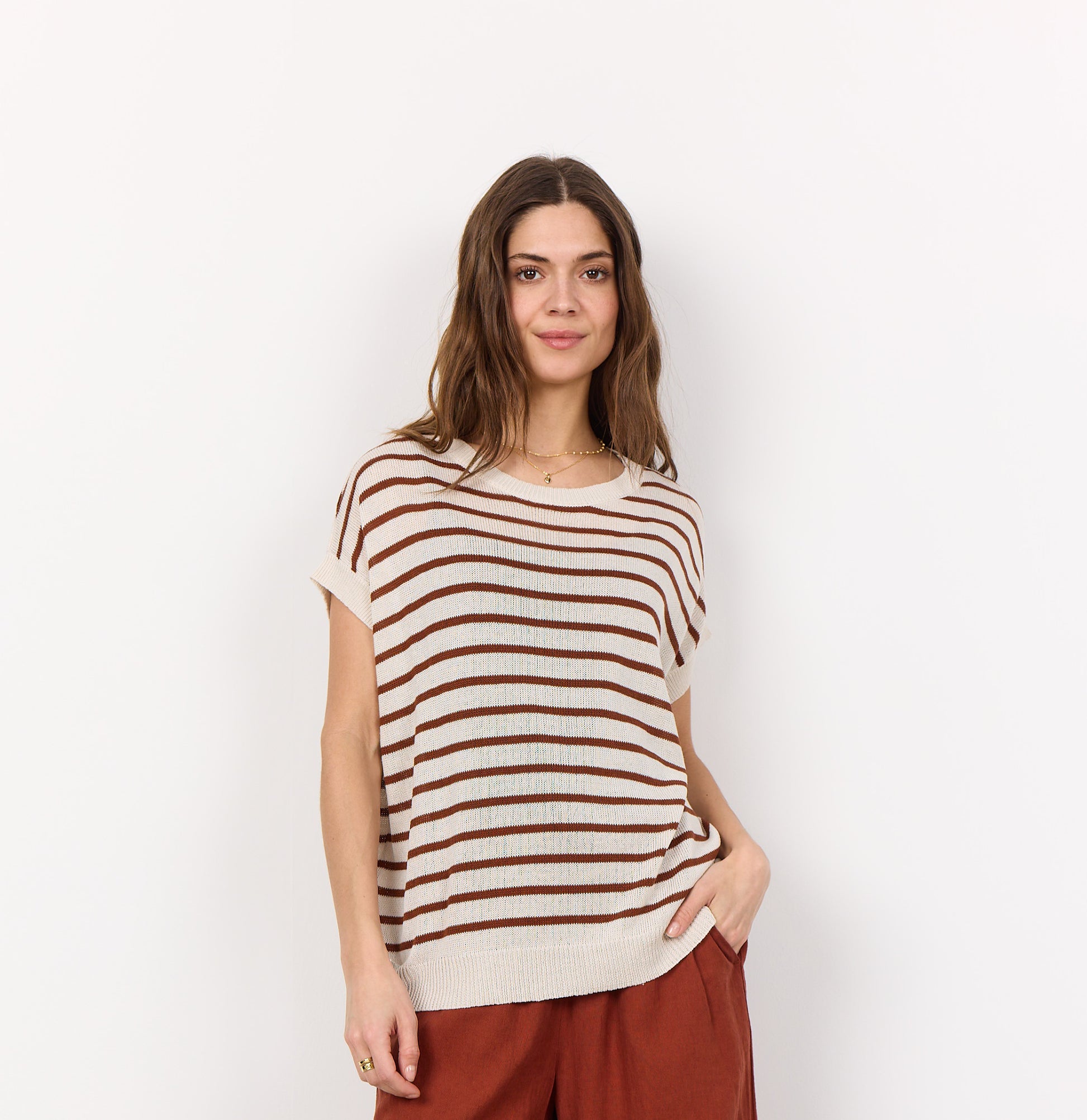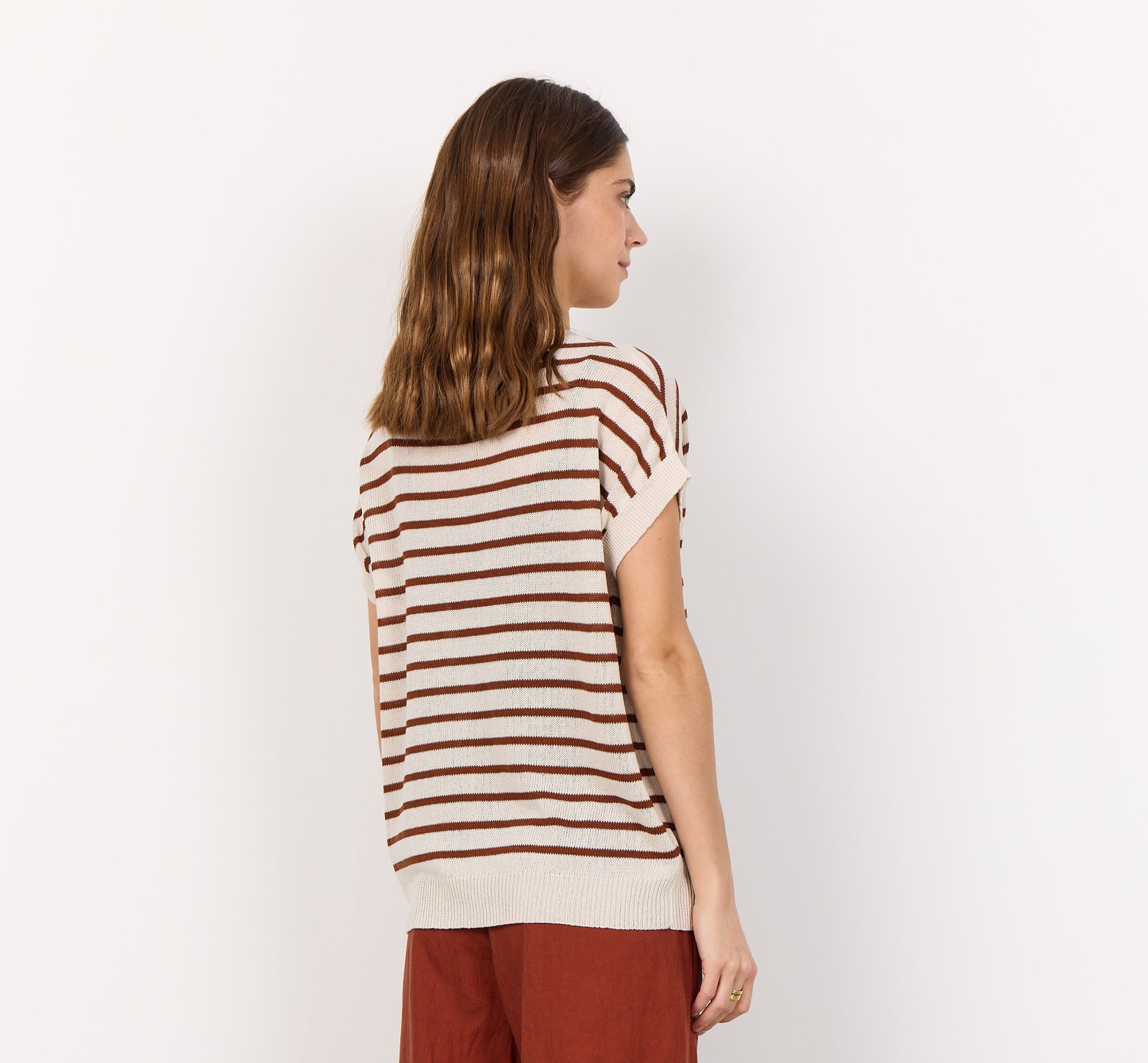 A comfortable T-shirt composed of 58% Acrylic, 26% Viscose, and 16% Linen. It has a relaxed fit with a ribbed collar and features a striped pattern with a textured finish. This T-shirt can be paired with various bottoms and layered under jackets for a casual look.