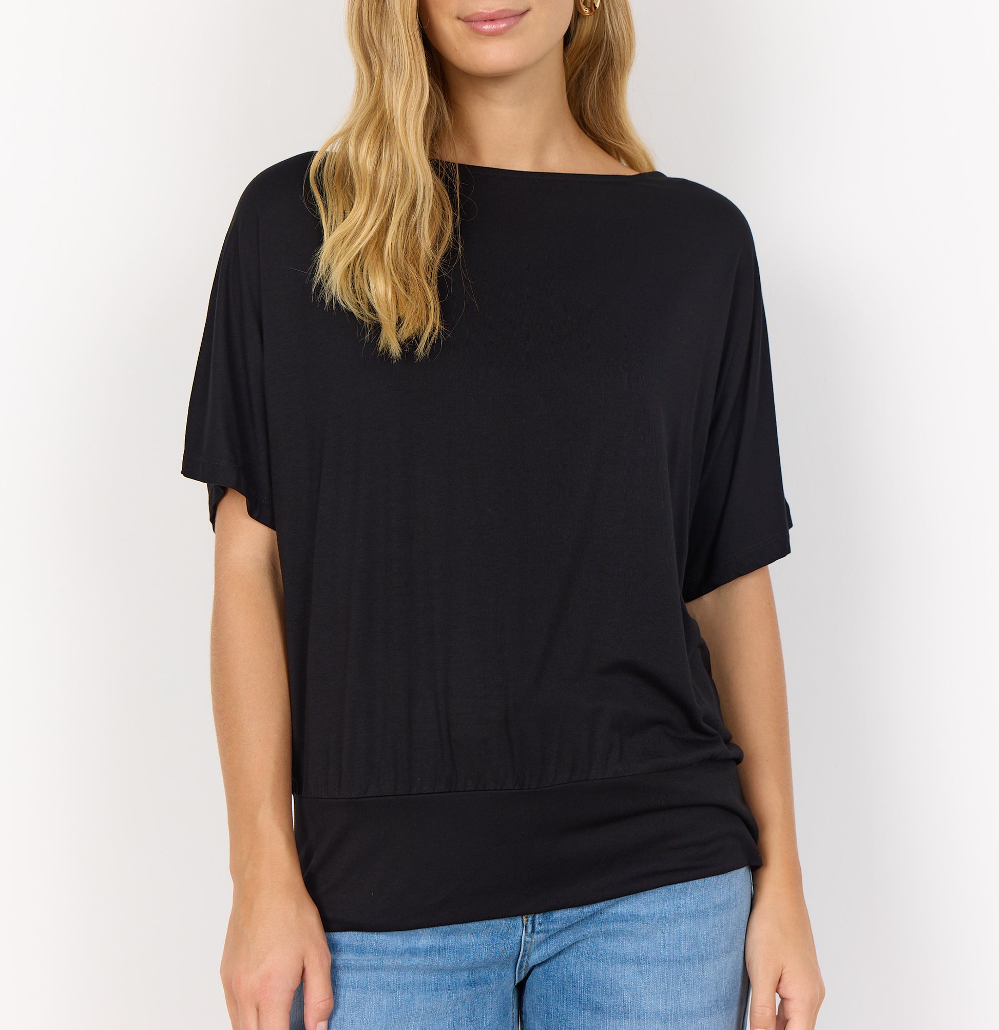 A soft blouse crafted with a comfortable blend of 93% Lyocell and 7% Elastane. This top features a relaxed cut, a round neckline, loose short sleeves, and a band at the hem for a flattering, drapey silhouette. Pair it with tailored trousers or a flowing skirt for a refined daytime look.