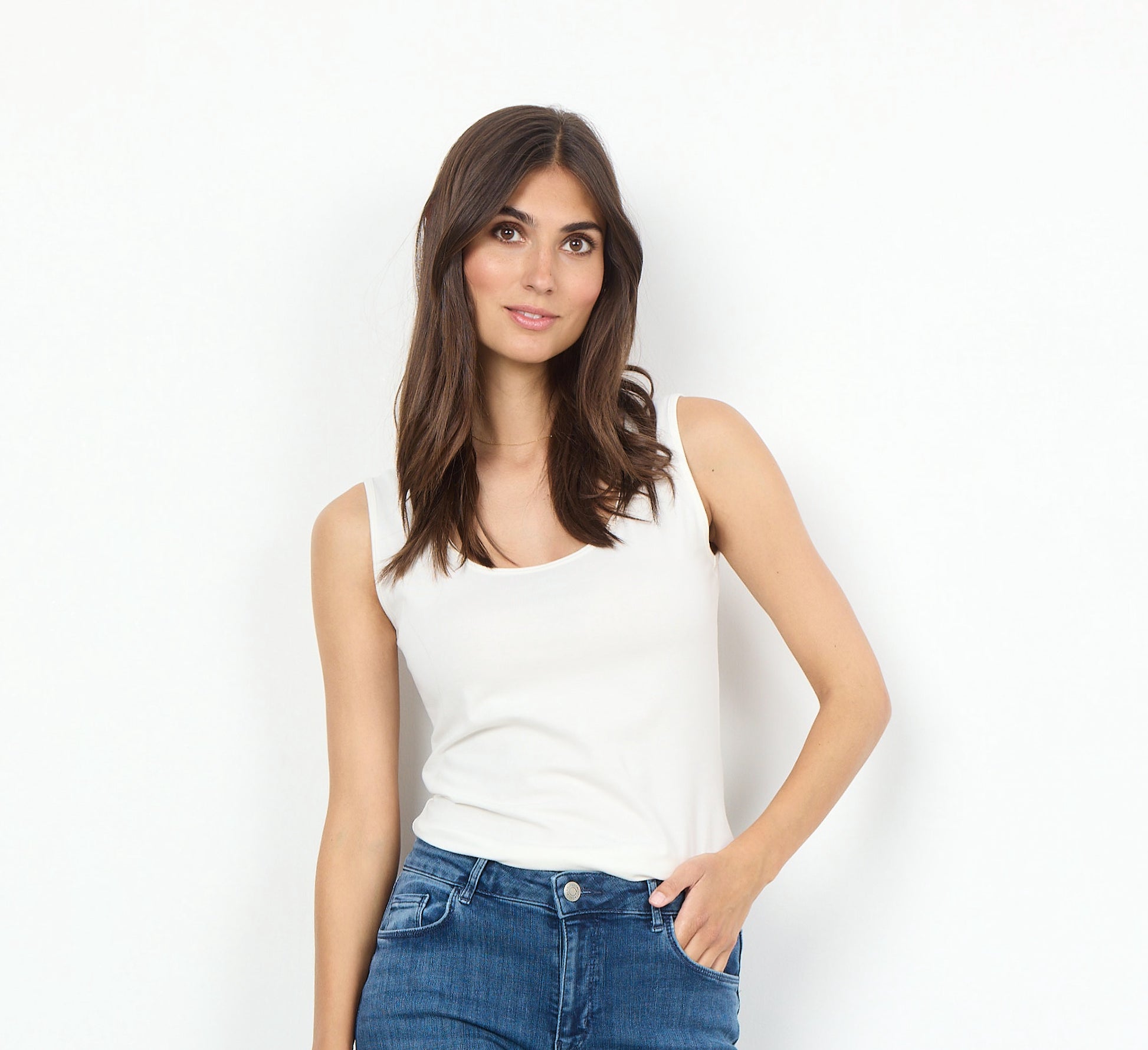 A basic top made from 58% cotton, 36% polyester and 6% elasthane. The top has a simple design with a round neck. The perfect basic summer item for your wardrobe!