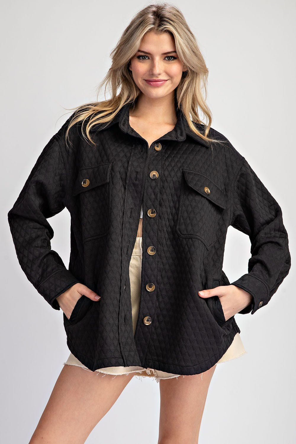Solid textured long sleeve shacket featuring a collared neckline, a button down front, buttoned cuffs, two flap chest pockets, two side hip pockets and a rounded bottom hem.