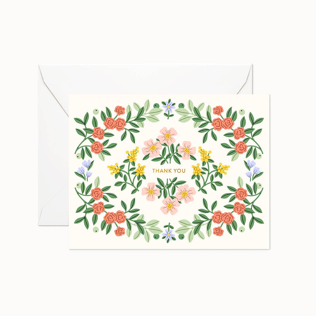 Express your gratitude with our elegant thank you card featuring a beautiful, symmetrical version of our meadow pattern with added gold foil text.